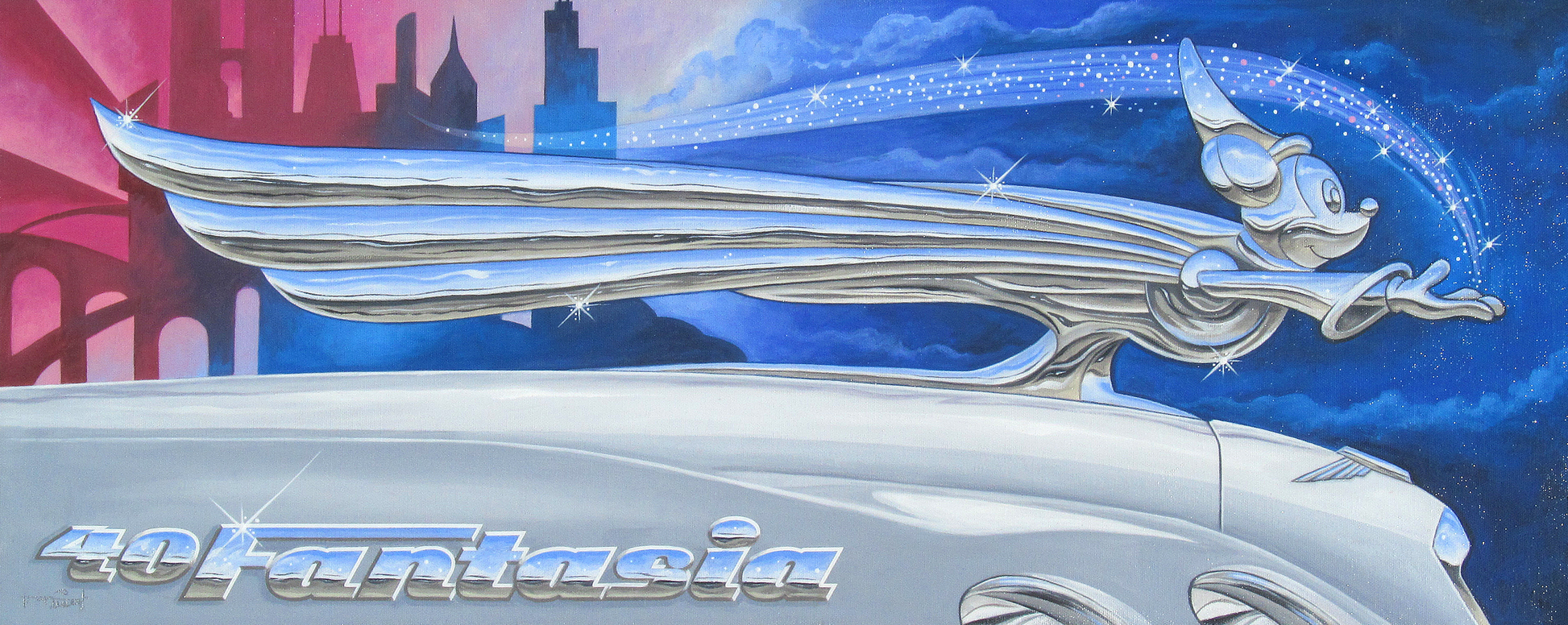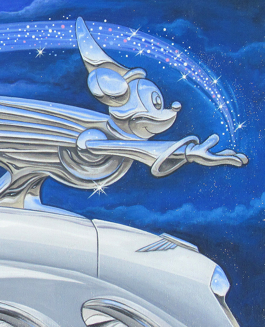 Bring Disney magic to your art collection with this captivating painting of Mickey Mouse from Fantasia, reimagined as a chrome hood ornament. This unique piece combines classic animation with automotive styling, creating a conversation starter that celebrates both Disney nostalgia and artistic innovation. The "40 Fantasia" artwork adds a touch of whimsy and wonder to any space.